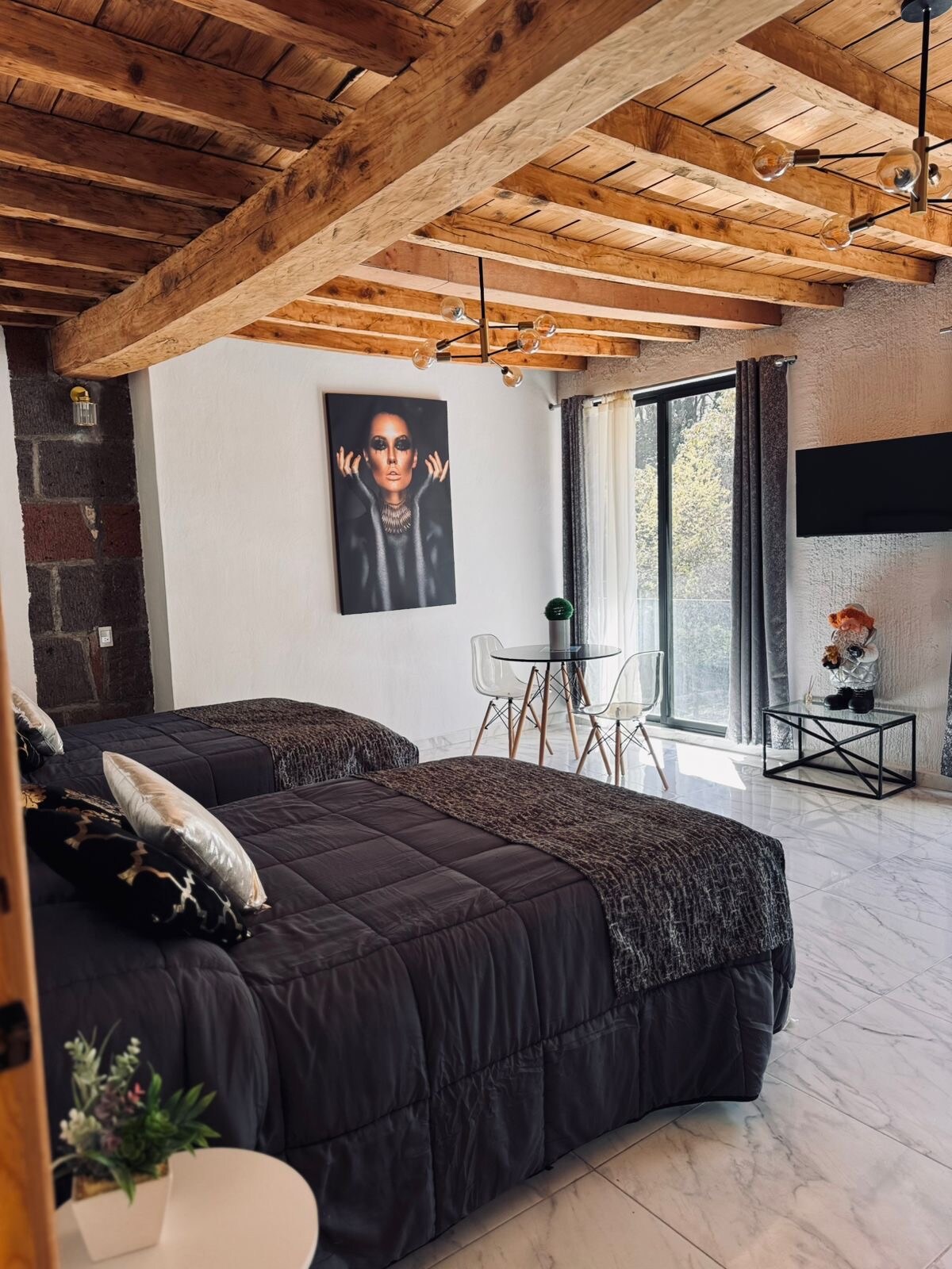 Séjournez à l'hôtel Veta Corona, construit sur une ancienne veine d'or exploitée à l'époque de l'exploitation minière. À seulement deux minutes du centre de Tlalpujahua et entouré de forêt, vous profiterez d'une vue spectaculaire, du chant des oiseaux et de la visite des écureuils. Détendez-vous dans une chambre confortable et vivez l'histoire, la nature et la tranquillité en un seul endroit. Vous ne voudrez pas quitter cet endroit si spécial. Nous pouvons placer une surprise sans frais, dites-nous simplement si vous fêtez un anniversaire ou un anniversaire