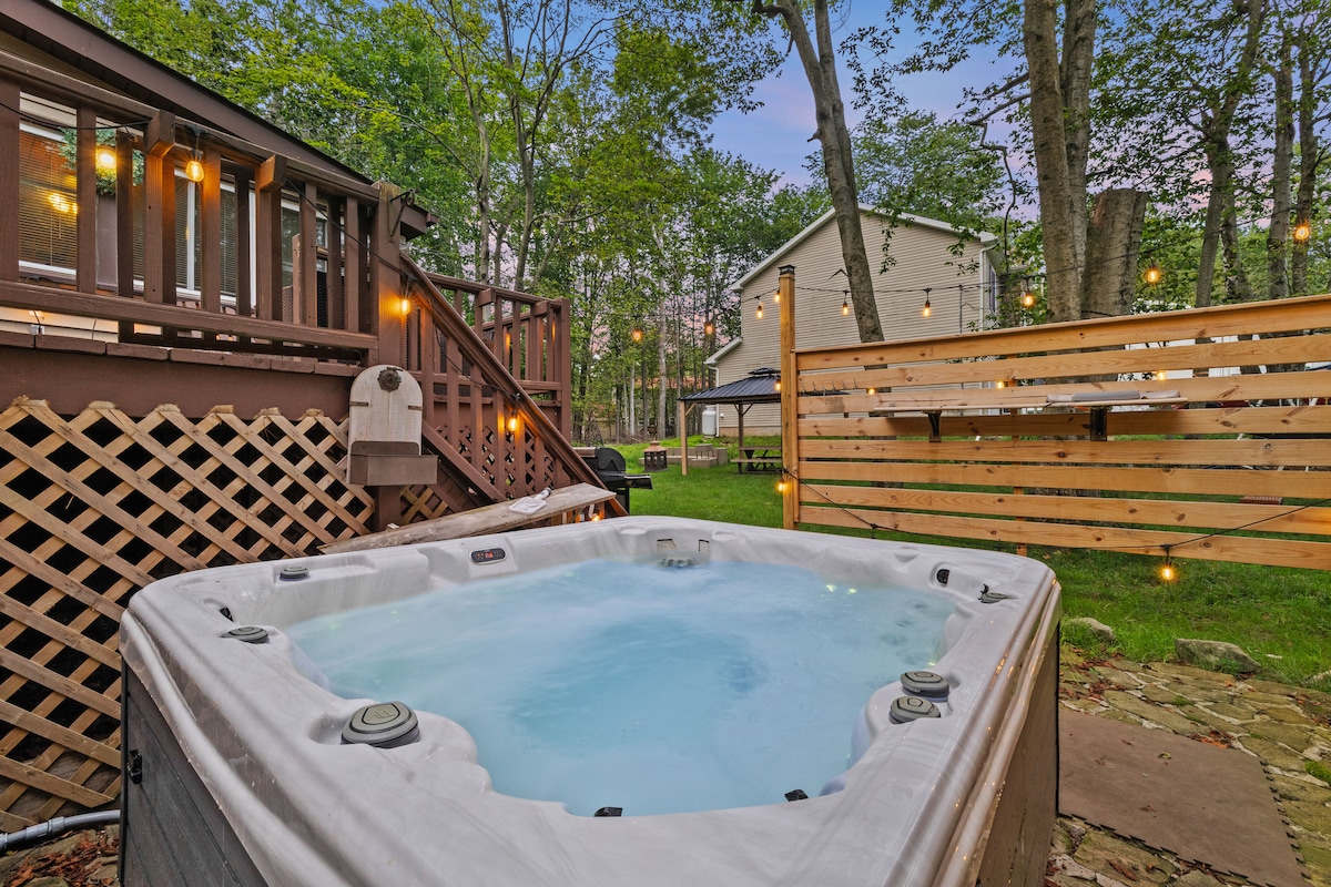 Évadez-vous dans notre escapade sereine des Poconos ! Nichée parmi des arbres majestueux avec des vues imprenables dans toutes les directions, notre retraite est le sanctuaire idéal pour la détente. Détendez-vous dans le jacuzzi privé et imprégnez-vous de la tranquillité ou installez-vous confortablement autour du brasero pour des nuits magiques sous le ciel étoilé. L'observation des étoiles dans toute sa splendeur ! Idéalement situé à proximité des principales attractions des Poconos : Camelback Mountain, Kalahari, Great Wolf Lodge et Mount Airy Casino. Si vous avez des questions, je suis là pour vous aider.