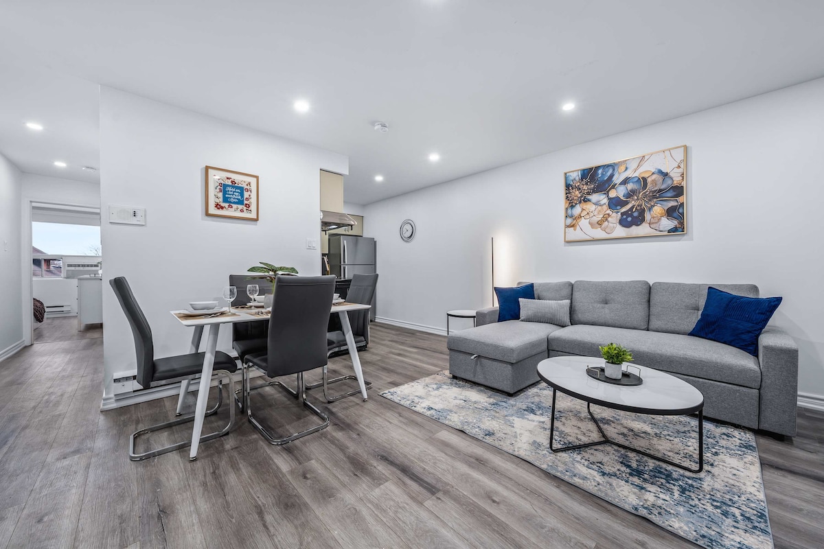 Installez-vous dans cet élégant appartement de 2 chambres dans l'un des quartiers les plus animés de Toronto. Avec 2 lits Queen Size, un canapé-lit confortable, une cuisine complète, un coin repas et une télévision connectée de 55 pouces, il est idéal pour accueillir jusqu'à 5 personnes. À quelques pas des cafés, des boutiques, des espaces verts et des transports en commun, c'est le point de départ idéal pour explorer la ville. Que vous soyez là pour un week-end ou un séjour prolongé, profitez du confort, de la commodité et d'une véritable ambiance locale.