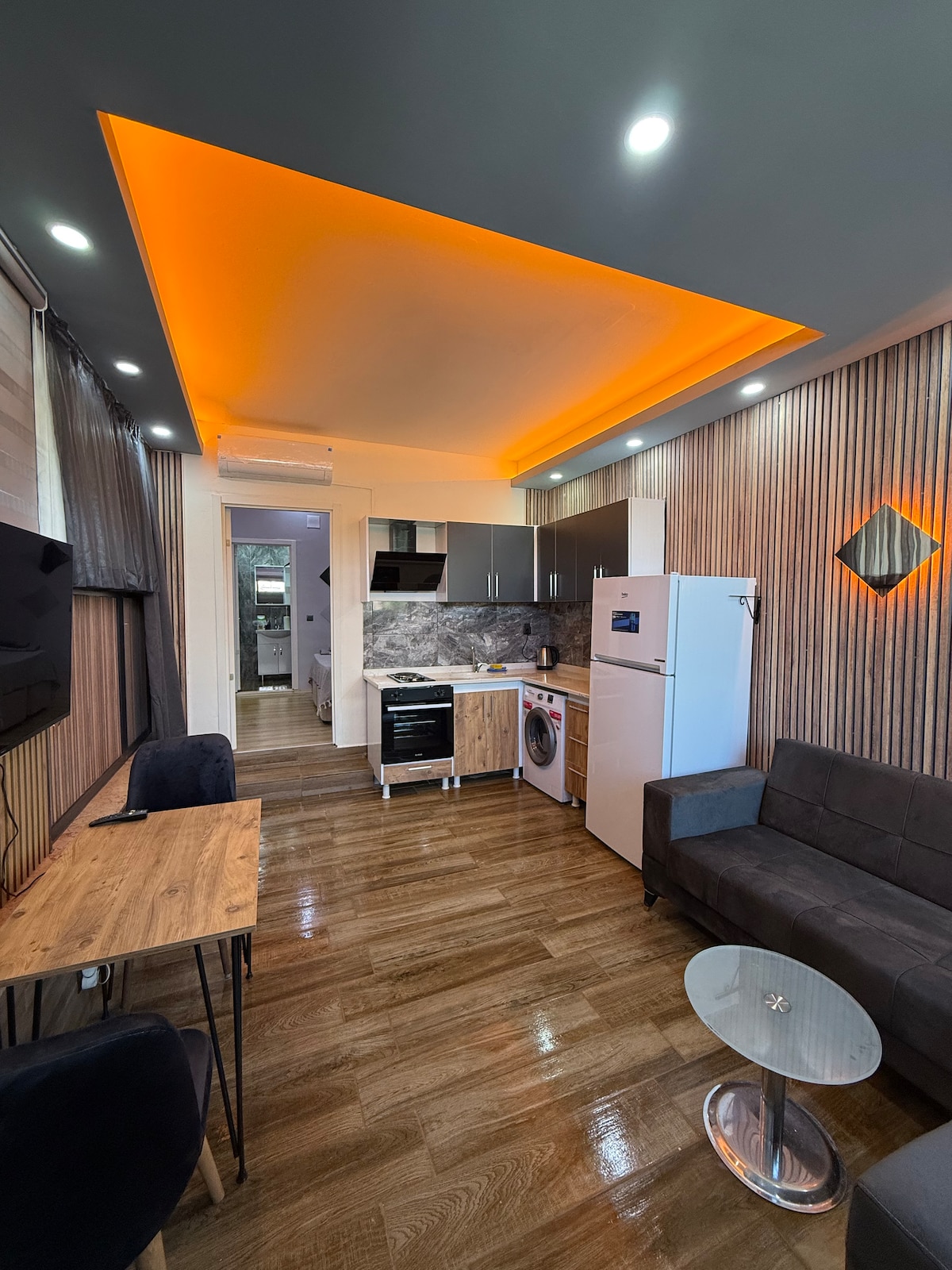 Nouveau, entièrement équipé avec les meubles et appareils électroménagers nécessaires, appartement 1+1 (1 chambre et 1 cuisine-salon) Internet rapide et stable. Pour 2-3 voyageurs, vous pouvez avec des enfants, avec des animaux sur demande. Palm City Mall est à 15 minutes à pied, le centre commercial Forum est à 35 minutes à pied et le remblai est à 10 minutes en voiture. Tout dans l'appartement est neuf, les appareils ménagers de la marque Beko, le mobilier design a été fait sur commande. Il y a de la vaisselle, du linge de lit, des serviettes. Convient aux voyages d'affaires et aux vacances en famille.