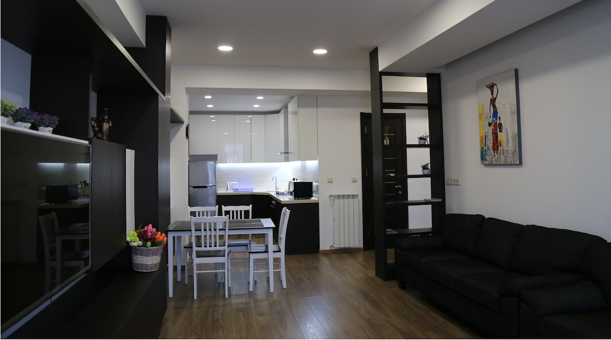 New sunny spacious 1 bedroom apartment. Located in a quiet area, close to the city center, 6 min walk to metro station 300 Aragveli. Well designed and comfortable. Fully equipped and furnished. Balcony and mountain view. Total area - 60 sq.m. Has a private entrance. There are bus stops, grocery 24/7, pastry & wine shops, restaurant, beauty salon, banks, pharmacy nearby. It’s a good choice for a couple, family or solo traveler to live and to work. Lockbox is available for self check-in.