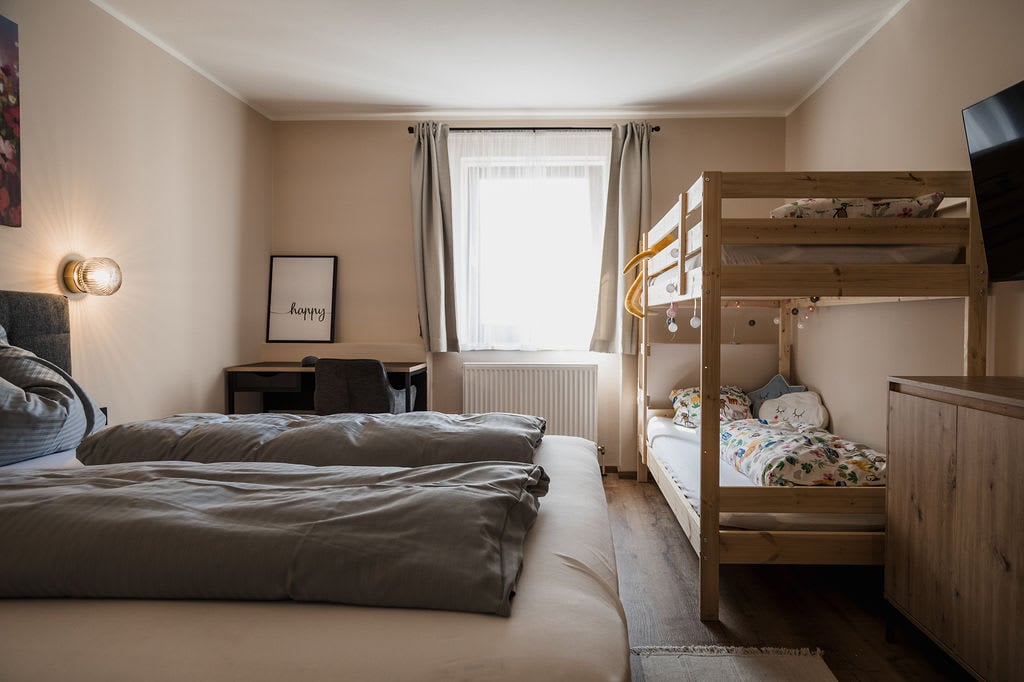 Willkommen im stilvoll-naturnahen Familienzimmer „Kolibri“ im Lindengut Natternbach – liebevoll gestaltet für Familien, die Ruhe, Naturverbundenheit und echte Herzlichkeit suchen. Auf ca. 25 m² erwarten euch: 🛏 1 komfortables Doppelbett für die Eltern 🛌 1 Etagenbett für zwei Kinder – gemütlich & praktisch 🛁 Eigenes Bad mit Dusche & WC 📺 TV mit Netflix, kostenloses WLAN 🤑 Viele Vorteile wie z. B. vergünstigter Familieneintritt ins IKUNA Ideal für 2 Erwachsene + 2 Kinder