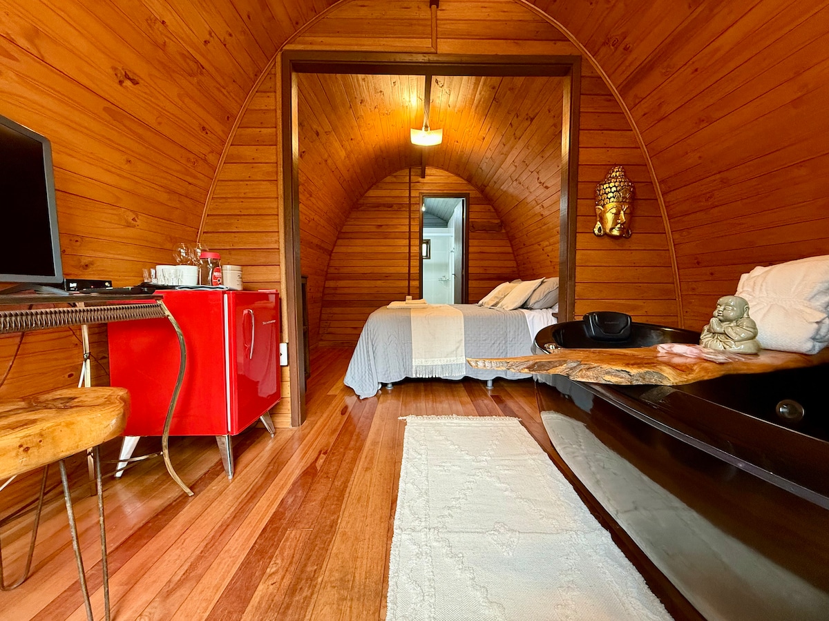 Cabane avec jacuzzi, vue sur la forêt et petit déjeuner