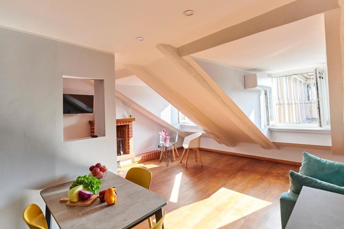 L'appartement est situé dans un immeuble du XVIIIe siècle (dans l'ancien quartier romain, le cœur le plus ancien de la ville) et vous permet de visiter la ville à pied. Il s'agit d'un grand studio mansardé (40 m²), avec un lit double (160x200), un canapé-lit convertible en lit simple ou double (160x200), une cuisine équipée et une grande salle de bains lumineuse également équipée d'un lave-linge/sèche-linge. Également : ascenseur, porte de sécurité et chauffage programmable.