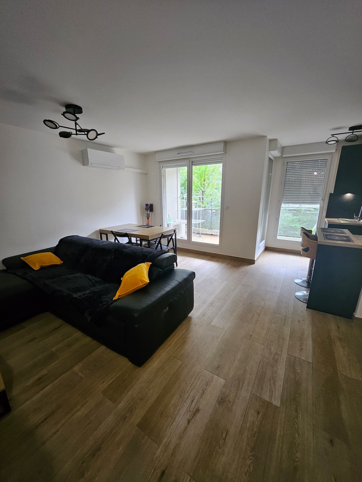 Situé dans le centre de Décines, appartement F2 de 44 m2 situé à 20 min de Lyon-centre, 10 min d'Eurexpo en voiture, 20 min de l'aéroport Saint-Exupéry en voiture ou par transport en commun. Au 1er étage avec ascenseur dans une résidence à proximité de tous commerces. Tout le mobilier est neuf. Cuisine équipée ouvrant sur séjour avec canapé convertible 2 places, TV connecté, wifi, chambre avec lit 2 places et TV, salle de bain, toilette.