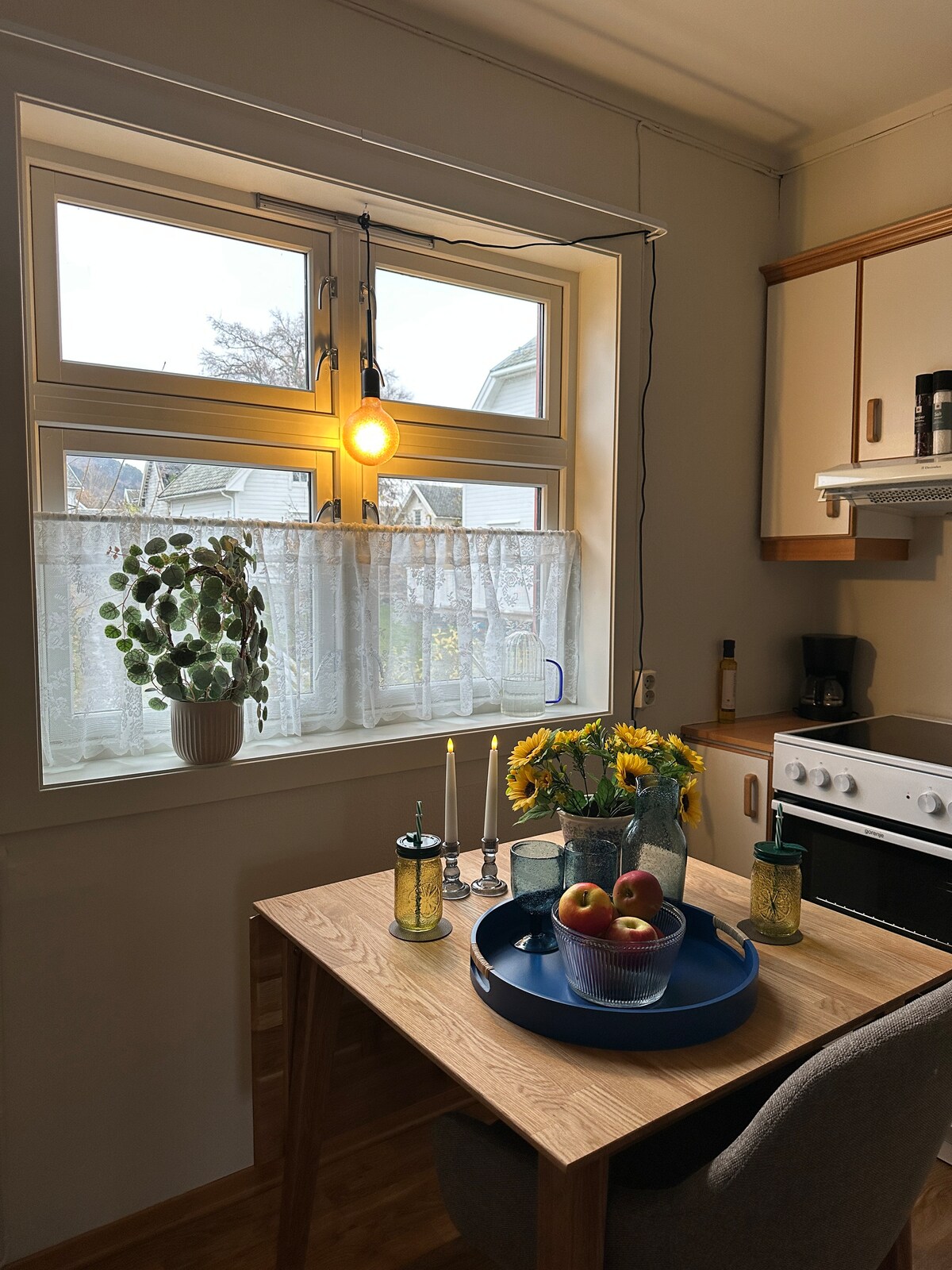 Appartement lumineux et moderne situé au centre de Volda, au milieu des puissantes Alpes Sunnmøre. Proximité immédiate de la mer et des montagnes, et à proximité du centre commercial et des restaurants, etc. Il y a une chambre avec un lit double (150x200), qui peut accueillir deux personnes. Une troisième personne dormira dans le salon sur le matelas gonflable, éventuellement sur le canapé. Le logement est équipé de tout ce dont vous avez besoin. Voici une télévision avec Chromecast, des jeux de société et des livres pour les jeunes et les moins jeunes. WIFI et parking gratuits. Courte distance de l'aéroport, à seulement 12 minutes de l'appartement.