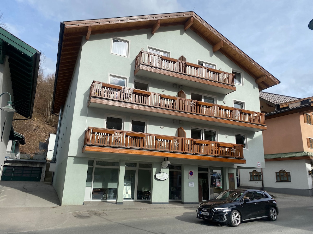 1er étage, balcon avec vue panoramique sur les Alpes 70 m - téléski de montagne, 300 m - piscine Wasserwelt, 25 m - école de ski et arrêt de ski-bus, 300 m – télécabine Flying Mozart. La taxe de séjour de 2,80 EUR/nuit/personne à partir de 15 ans est exclue dans le prix et payable en espèces à l'arrivée. La cuisine est équipée pour cuisiner, mais il n'y a PAS de nourriture/huile/sucre. Les animaux domestiques ne sont pas autorisés. Le linge de lit, les serviettes de toilette et de douche (1 set/personne) sont inclus.