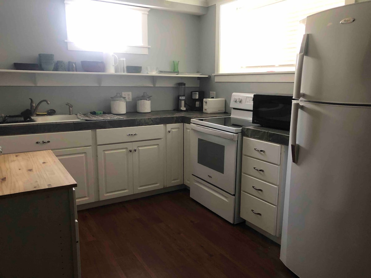 Détendez-vous dans ce logement calme et élégant. La petite maison n'est pas une vraie petite maison, mais une chambre avec 1 lit Queen Size, une salle de bain, une cuisine/un salon. Causeuse inclinable Lazy Boy et fauteuil inclinable Lazy Boy (très confortable) pour regarder un film devant une fausse cheminée. La cuisine est équipée avec tout ce dont vous avez besoin pour préparer un repas fait maison. Le micro-ondes est une friteuse à air/micro-ondes. Profitez de votre soirée/matinée assis sur le porche couvert avec votre boisson préférée.