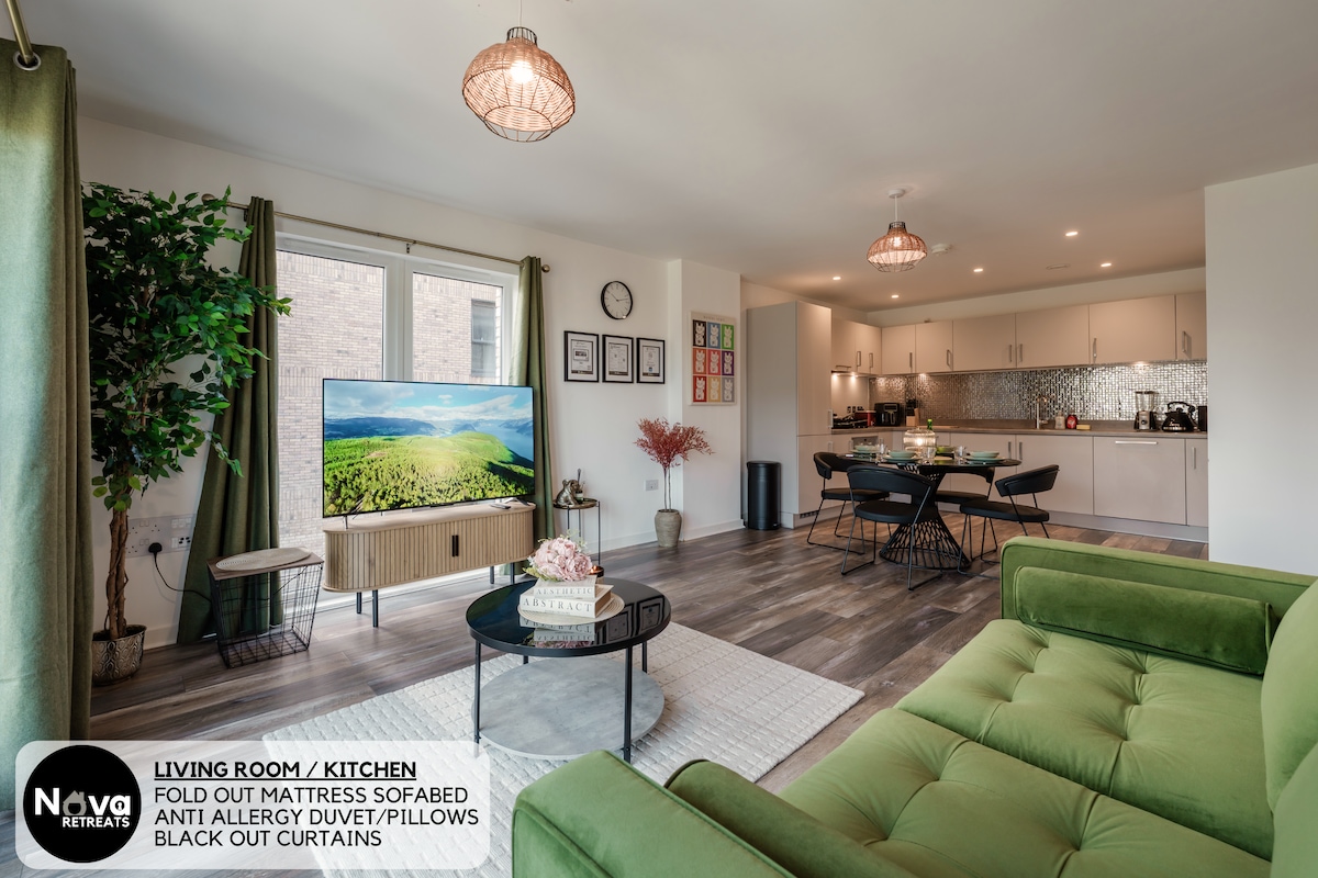 Bienvenue chez vous, loin de chez vous. Un appartement moderne de 2 chambres avec patio privé dans le prestigieux Belgrave Village, à quelques minutes du centre de Birmingham. Parfait pour les familles ou les séjours d'affaires. Profitez d'un accès à une salle de sport élégante, à un espace de coworking et à une salle de cinéma (disponible à la location). Élégant, confortable et pratique - avec une connexion Wi-Fi rapide pour ceux qui travaillent à domicile ! Géré par Stones Throw Apartments.
