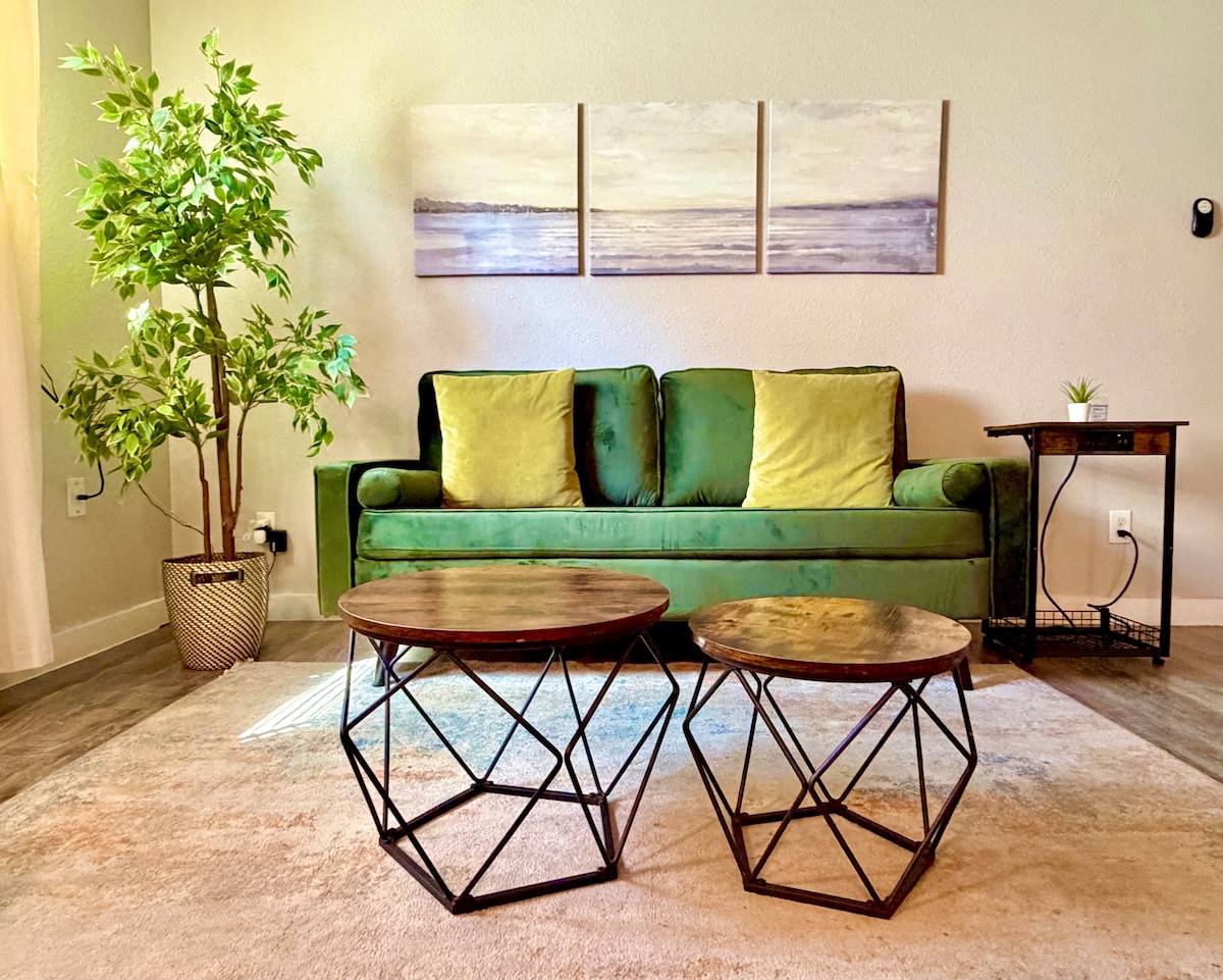 Profitez d'un logement élégant et central. Une chambre et une salle de bain récemment rénovées à moins d'un mile des FW Stockyards. Espace de vie confortable pour se détendre après une longue journée. La cuisine dispose de comptoirs en granit, d'un four à micro-ondes, d'un réfrigérateur et d'une cuisinière. Une cafetière pleine grandeur, du café de spécialité et de la crème vous attendent à votre arrivée. Des ustensiles de cuisine et de la vaisselle essentiels sont à la disposition de nos voyageurs. 2 téléviseurs Roku, ainsi qu'une connexion Internet haut débit pour votre plaisir.