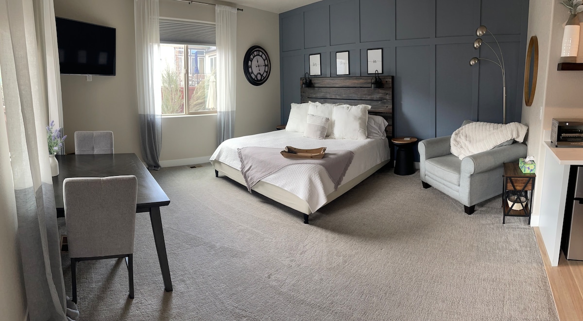 Bienvenue à la Lake House ! Cette suite de 500 pieds carrés donne sur un lac et un parc. Ce bel emplacement est neuf, construit en 2021 ! Par une entrée privée, vous trouverez une grande chambre de 15'x16' avec un lit King Size, une salle à manger, un coin salon et une télévision de 60". L'espace comprend également une chambre avec lits superposés, une salle de bain luxueuse, un micro-ondes et un mini-réfrigérateur. Détendez-vous et profitez de la vue tout en séjournant dans un emplacement centralisé à Loveland. À seulement 2 miles de l'I-25 et à 1 mile de l'autoroute 34 !