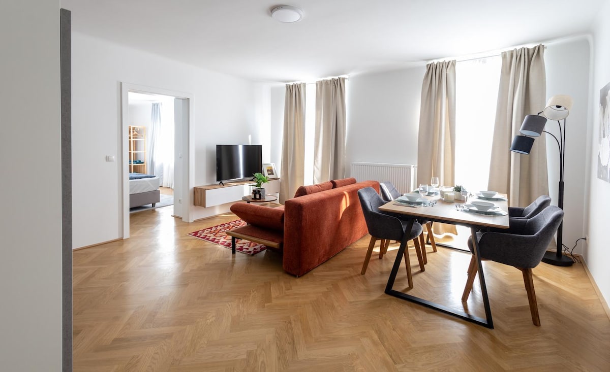 Élégant appartement d'une pièce (45 m²) au cœur de Vienne avec coin nuit séparé (matelas à ressorts ensachés de 160 cm), salle de bain spacieuse, lave-linge et cuisine entièrement équipée (avec Machine Nespresso). Balcon, climatisation, rideaux occultants, canapé-lit pour 1 à 2 enfants, coin repas pour 4. Le bus de l'aéroport s'arrête juste devant le bâtiment. Terrasse sur le toit partagée avec vue magnifique sur Vienne. Emplacement idéal pour les visites, la culture et les expériences culinaires !