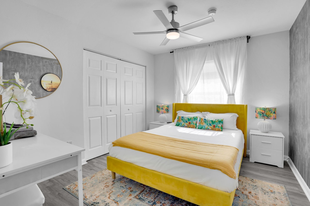 Niché derrière la maison principale, ce studio rénové confortable est une retraite semi-privée parfaite pour les célibataires ou les couples. 🌴Ambiance de style complexe hôtelier avec piscine chauffée ($) et espace extérieur spacieux avec ombre 🏠Studio privé/aménagé avec lit Queen Size de luxe, salle de bain, kitchenette, machine Nespresso, climatisation, télévision, bureau, placard, Wi-Fi rapide 1 Go/s 🔥Brasero à gaz, barbecue Blackstone, douche extérieure, grand salon extérieur, lave-linge/sèche-linge 🌷Entouré d'un aménagement paysager tropical vibrant qui crée une véritable ambiance d'évasion