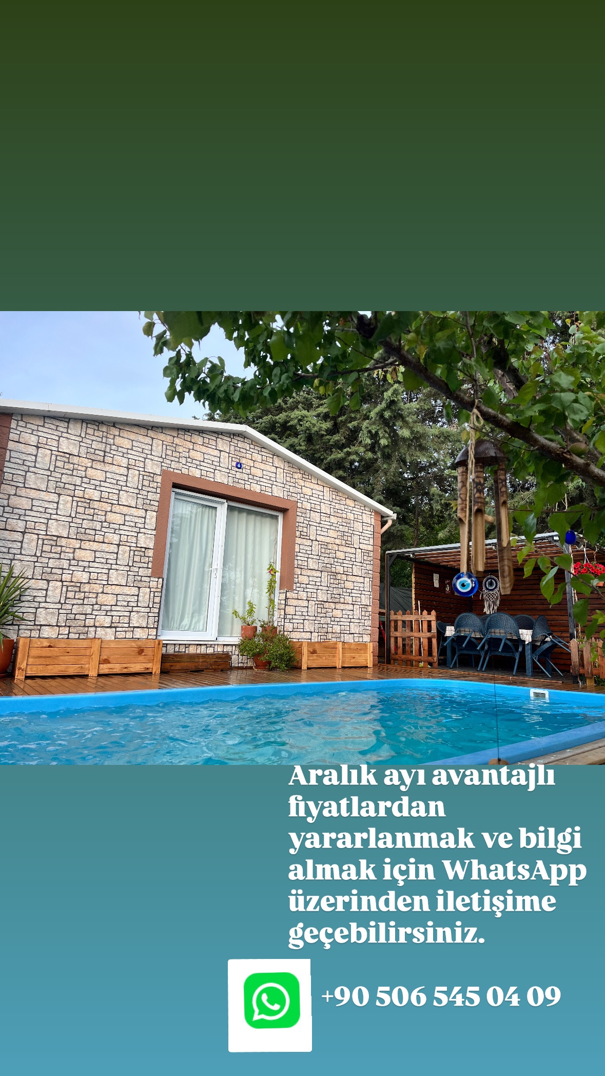 Doğanın güzelliklerine tanıklık edecek, zeytinliklerin içinde keyifli bir tatil yapabileceksiniz. Asma yapraklarının altında kahvenizi yudumlayabilir, sıcak havalarda havuzun keyfini çıkarabilir etrafı çamlarla kapalı havuzumuzda güneşlenebilirsiniz. Havuzda bulunan mini barda ve kuş evimizin içindeki dolapta içeceklerinizi tutabilir, dileğinize göre müzik açabilirsiniz. 200 mt yakındaki denizde de serinleyebilirsiniz. Mangal keyfi yapabilir isterseniz Mürefte’de yerel lezzetleri tadabilirsiniz.