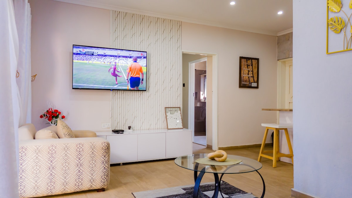 Appartement privé spacieux avec alimentation solaire + générateur 24h/24 et 7j/7, Wi-Fi rapide et télévision par satellite. À seulement 5 minutes à pied des cafés, des restaurants et du centre commercial. Profitez de la piscine, du service de blanchisserie et du confort de votre propre appartement sécurisé avec un capteur de mouvement tout autour.